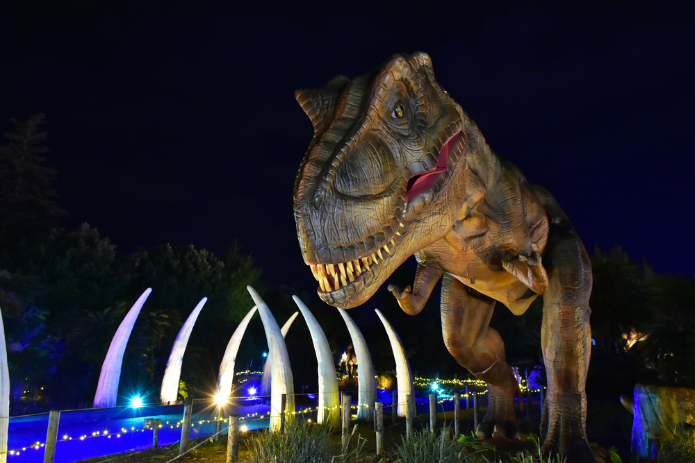 こちらはおすすめエリアのひとつ、ライトアップされた恐竜エリア。トリケラトプスやティラノサウルスが迫力あるお出迎えをしてくれます。