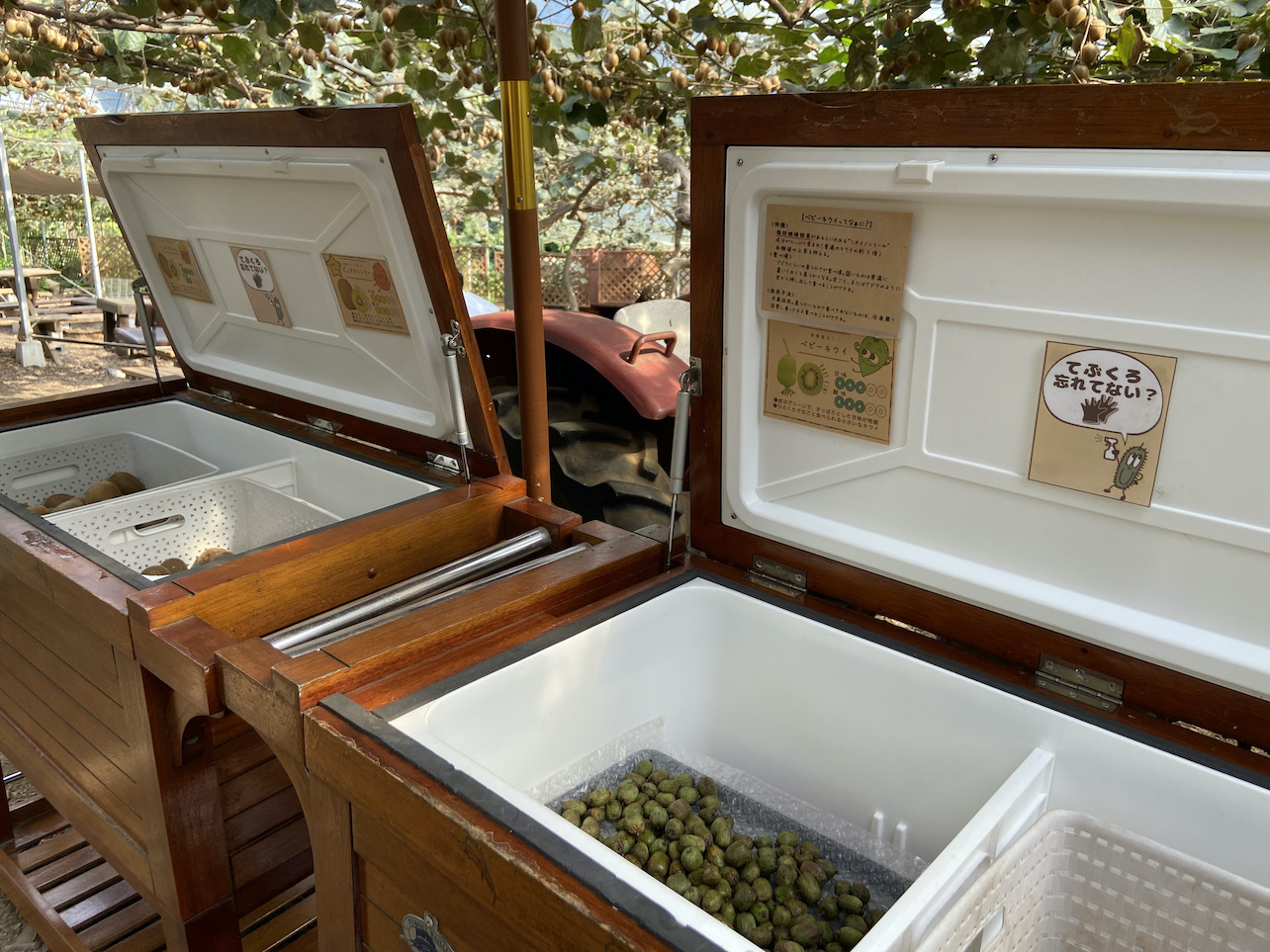 手を消毒し手袋をしてからケースの蓋を開けましょう。食べ頃のキウイが種類ごとに冷やされています。