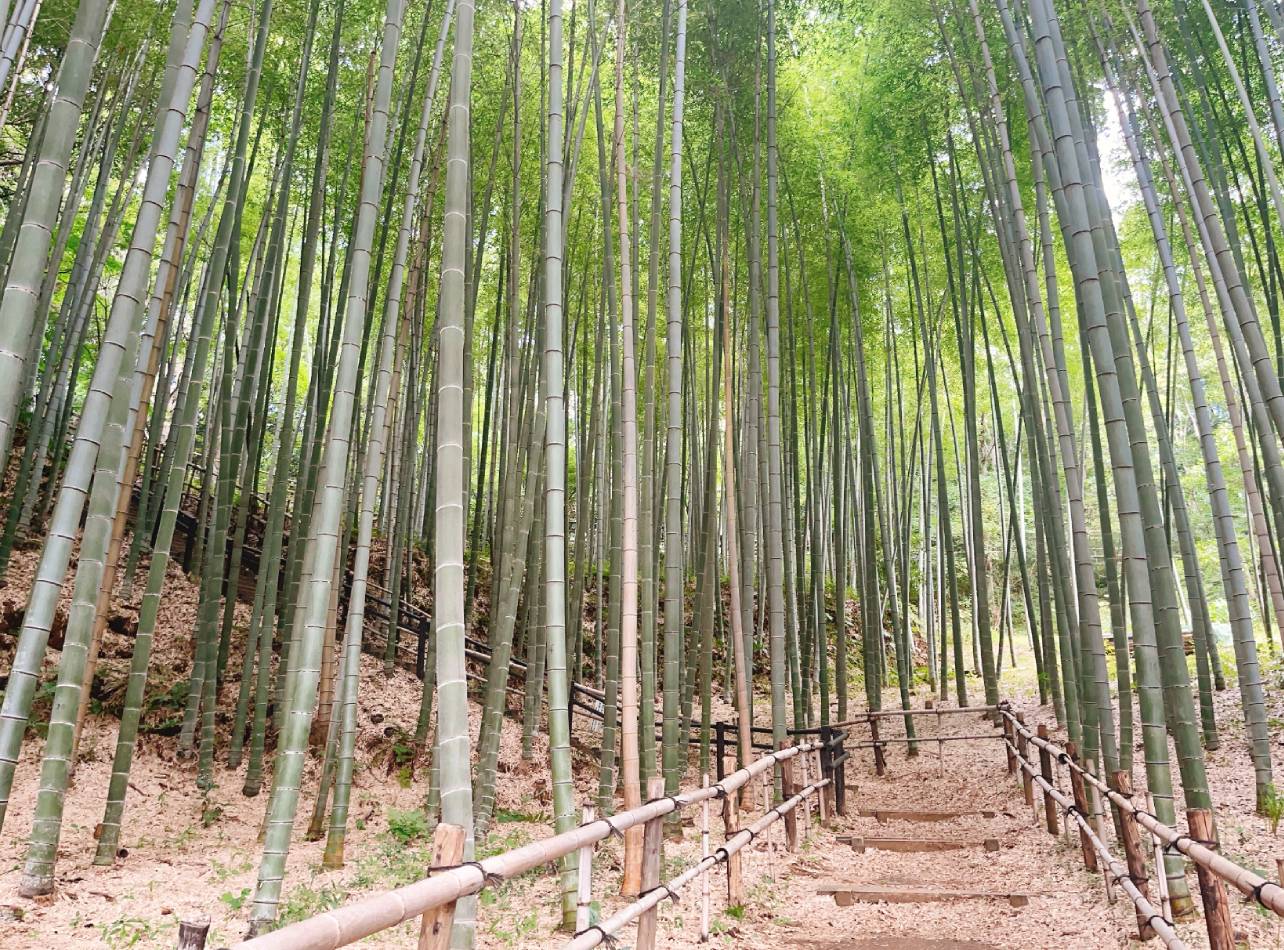 森のイメージから一新して、竹林ゾーンが見えてきました。竹は見通しやすく整えられていて、綺麗な竹林の小道が垣間見えます。