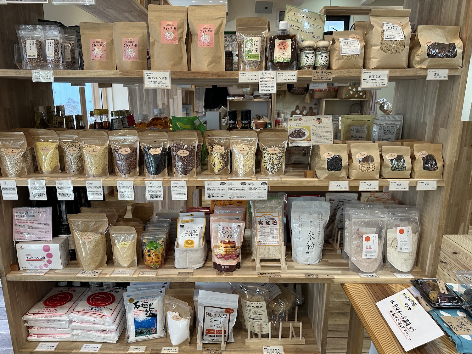 お子様が安心して食べられる料理を提供したいという店の想いから、売られている食品も健康に気を遣ったものに。お米は白米ではなく、玄米や黒米が並んでいます。