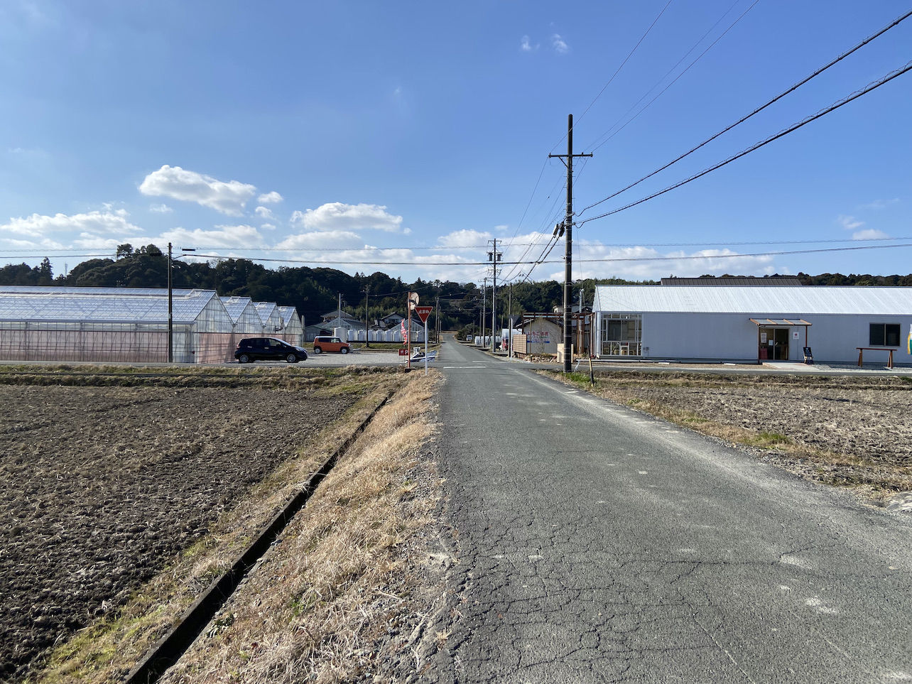 市街地を過ぎると豊かな農地が広がる掛川市。田んぼや畑、ハウスが並ぶのどかな田園地帯の中、県道253号を北へまっすぐ車で走っていると、やがて「いちごてらす」の看板が道沿いに見えます。