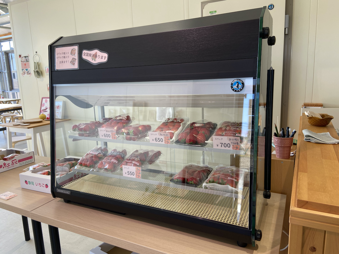 店舗の向かいはいちごを栽培するハウスで、店舗と同じ建物内に出荷作業場があり、摘みたてのいちごがすぐ届く立地。鮮度が落ちる暇がありません。