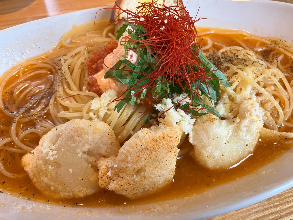 トマトの酸味とクリームが麺によく絡んでスープまで飲み干せそうな一品でした。