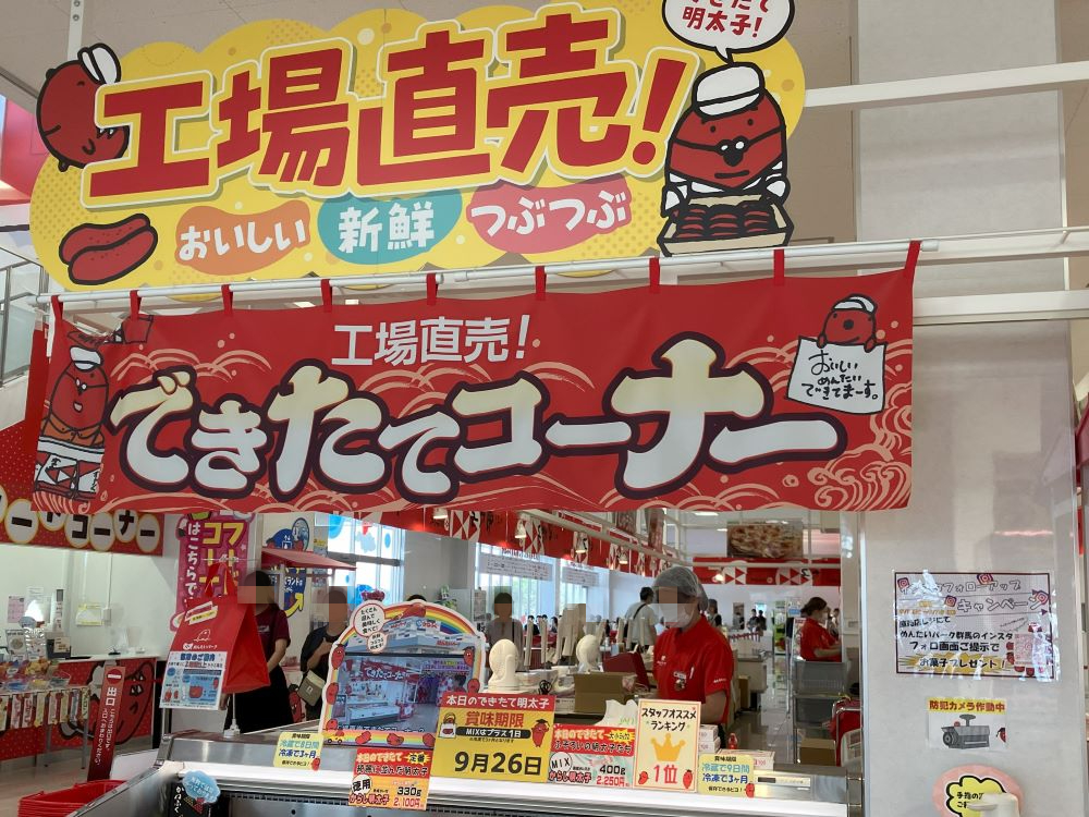 大きなPOPで目を引くのは「工場直売!できたてコーナー」。当日に作られたできたての明太子を販売しており、スタッフオススメランキング1位の看板商品です。