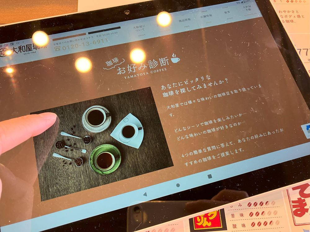 カウンターに設置されているタブレットから自分の好みのコーヒーがわかる「珈琲お好み診断」を試してみるのはいかがでしょうか?