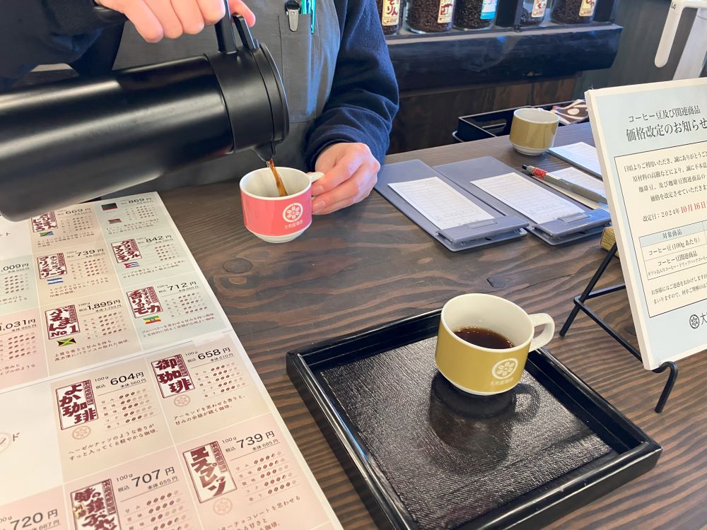 おすすめ銘柄の珈琲が2種試飲できるのもうれしい