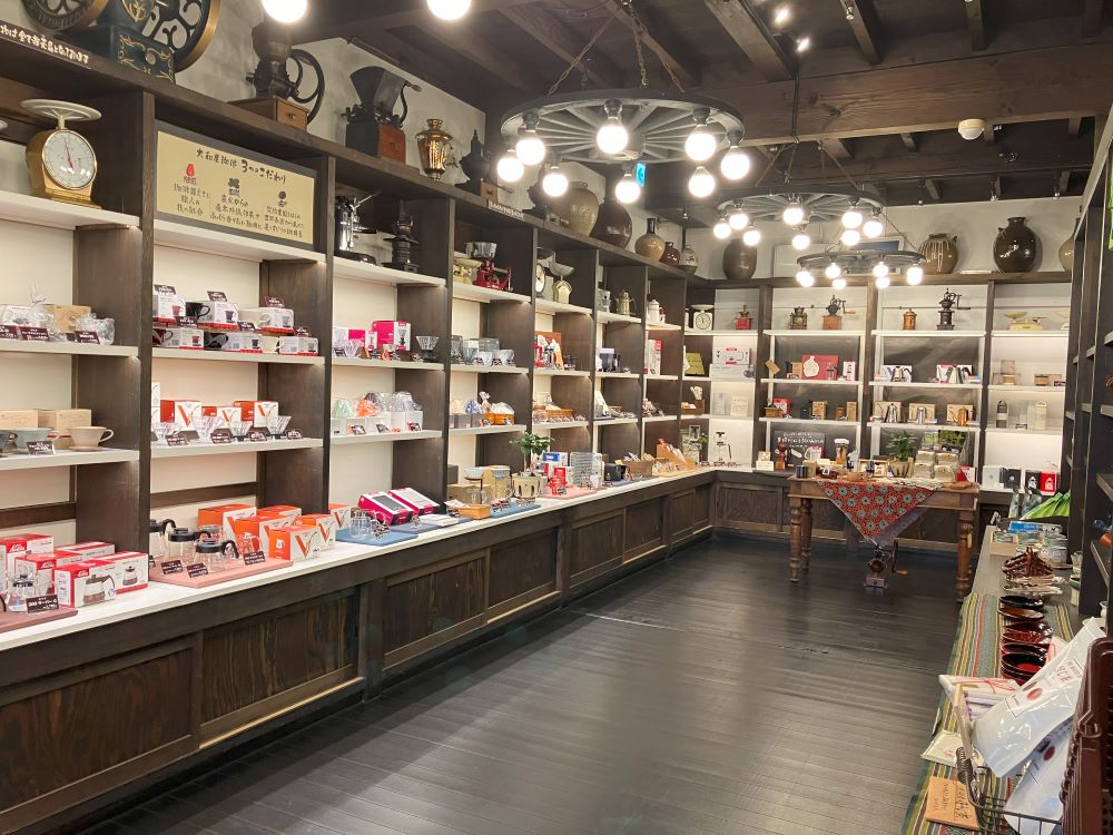 店内には珈琲グッズや陶器やオリジナル商品が並ぶ