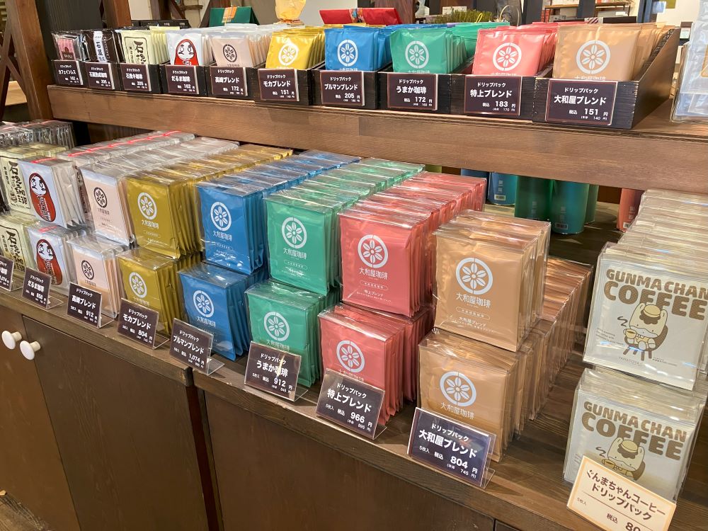 こちらも種類豊富で、高崎だるまやぐんまちゃんパッケージのドリップコーヒーも。