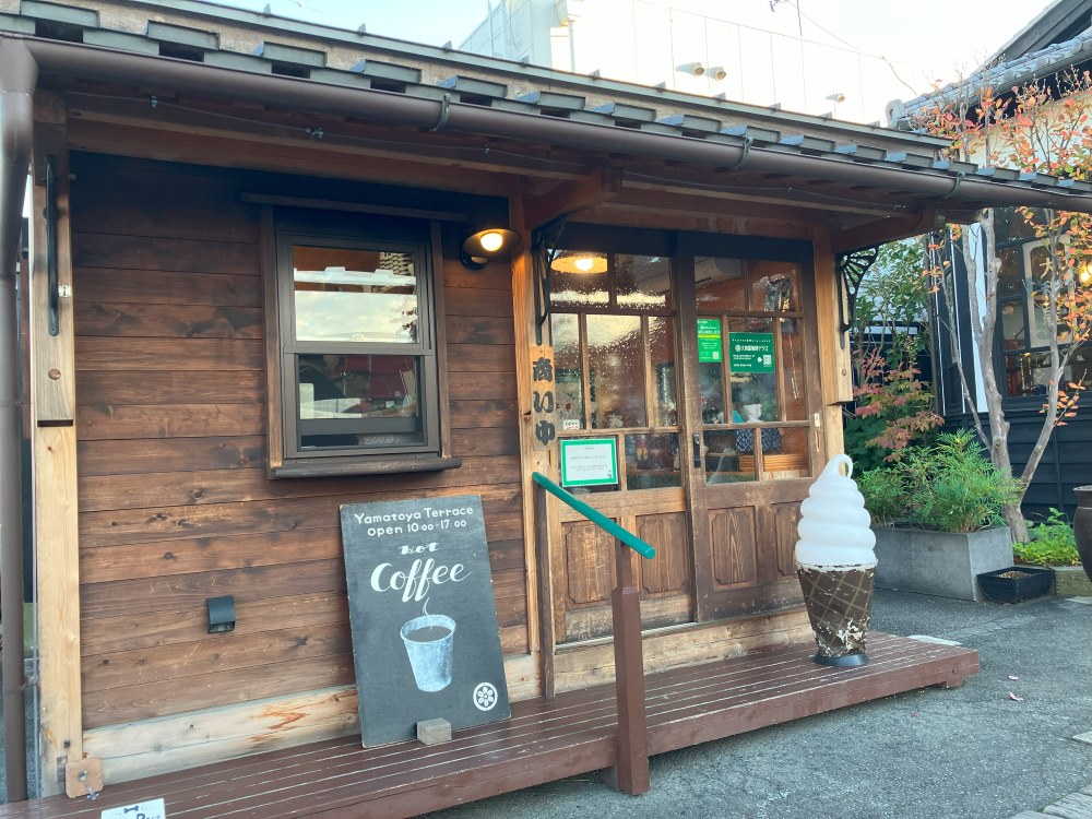 店舗前にはログハウスのような外観の「大和屋テラス」があり、淹れたてのコーヒーやソフトクリームのテイクアウト販売を行っています。