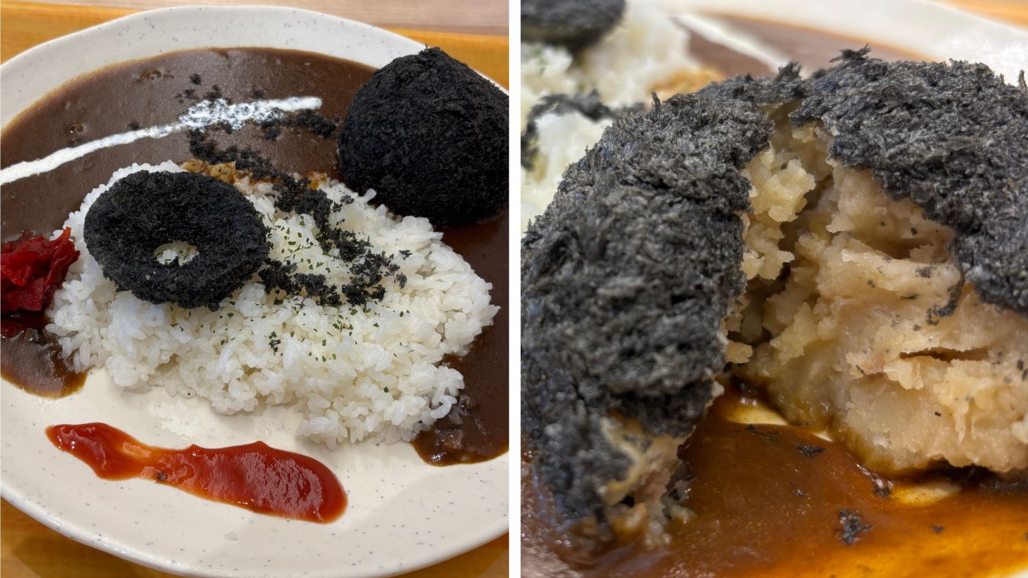 女性の握りこぶしほどの大きさがある黒いコロッケは、そのまま食べると甘くてホックホク。ごはんとコロッケ、カレーを一緒に食べるとじゃがいもの甘さをカレーが引き出してくれます。
