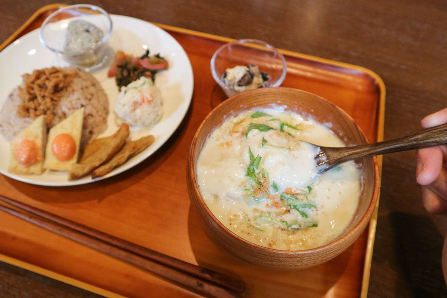 お食事は、お店イチオシの「豆乳スープセット」をいただきました。温かい豆乳スープと雑穀米、4種のお惣菜がセットになっています。