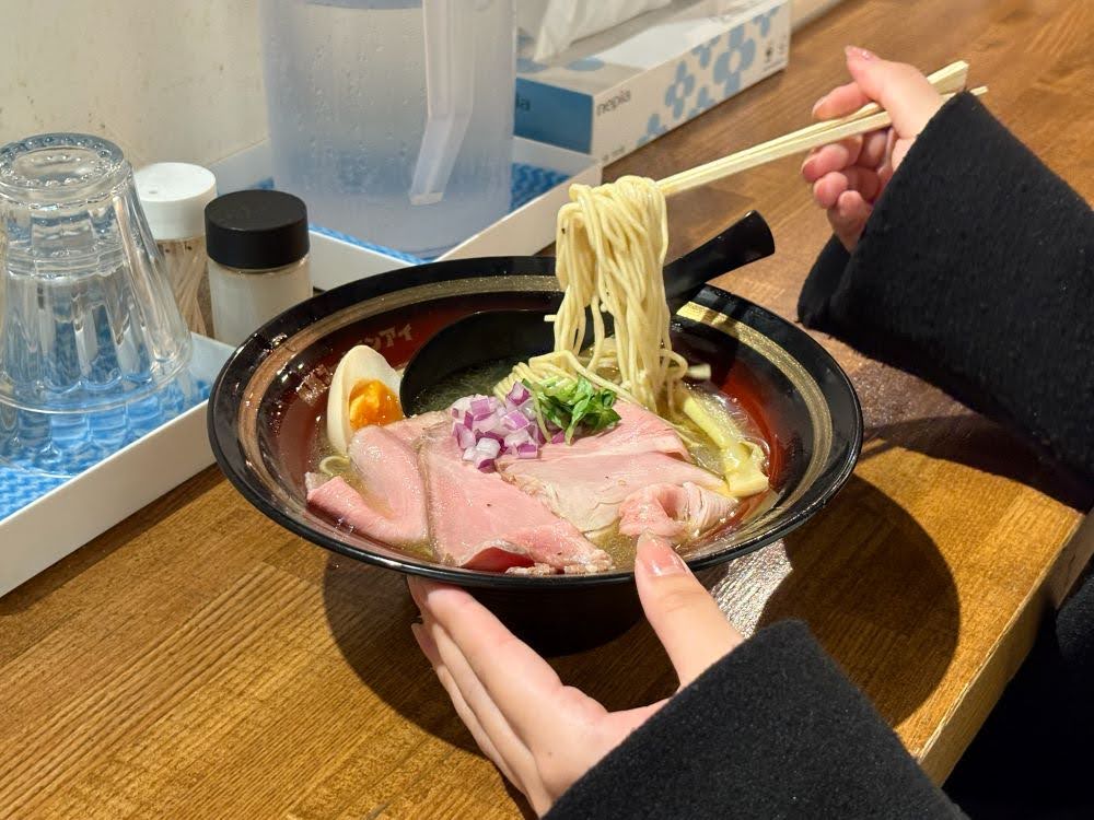 少し待つと、目の前にキラキラと輝くラーメンが!金目鯛のうまみを凝縮したスープに、スープをしっかりまとってくれる自家製の細麺が絶妙なバランスで、まさに絶品!