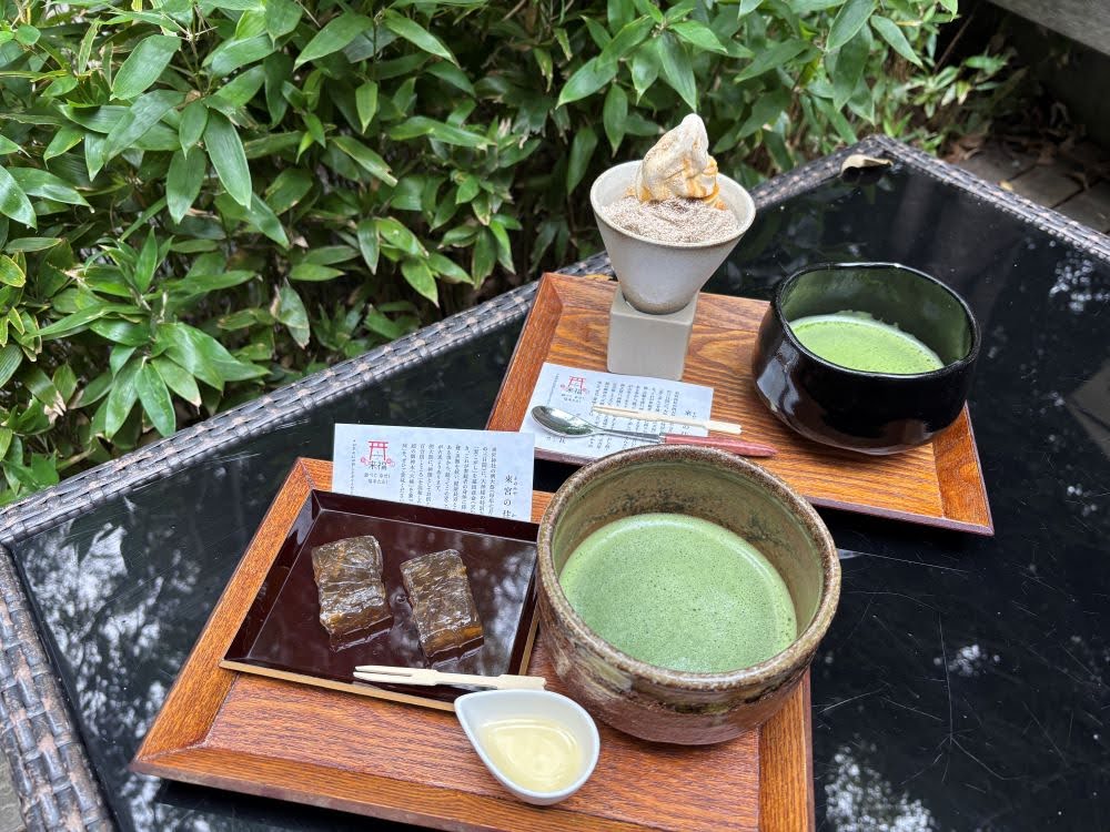左「だいだいわらび餅と抹茶のセット」右「わらび餅ソフトと抹茶のセット」