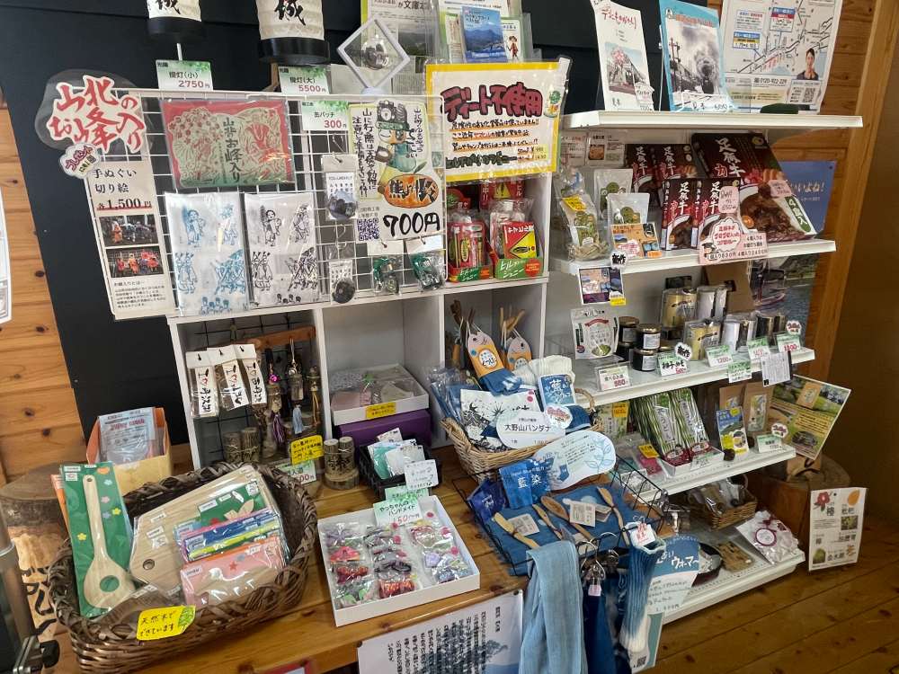 食べ物以外にも大野山をモチーフにしたバンダナや藍染アイテムも充実。お土産探しにおすすめです。