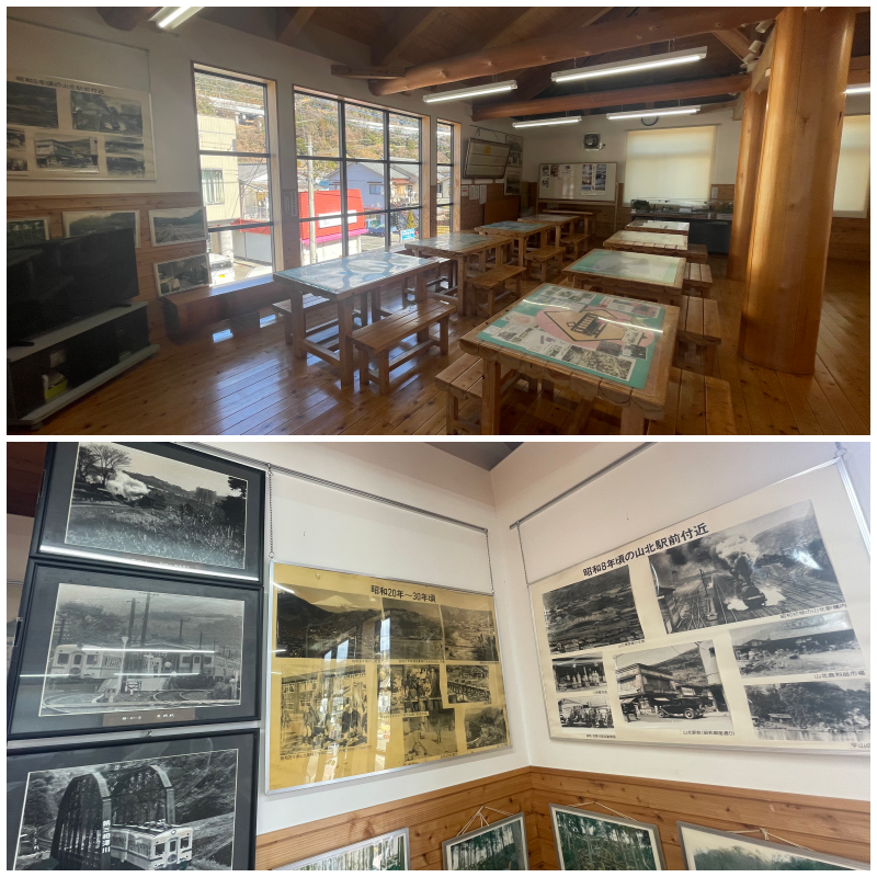 壁には、山北町の昔の写真が展示されていてます。今とは違う山北駅前の様子や、SL機関車が走っている姿を見ることができます。