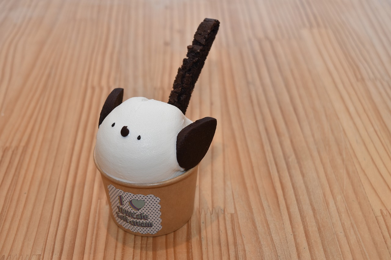 ソフトクリームは北海道産の低温殺菌牛乳を使用。 ココアのビスコッティと濃いココアクッキーで、しっぽや羽根を表現しています。