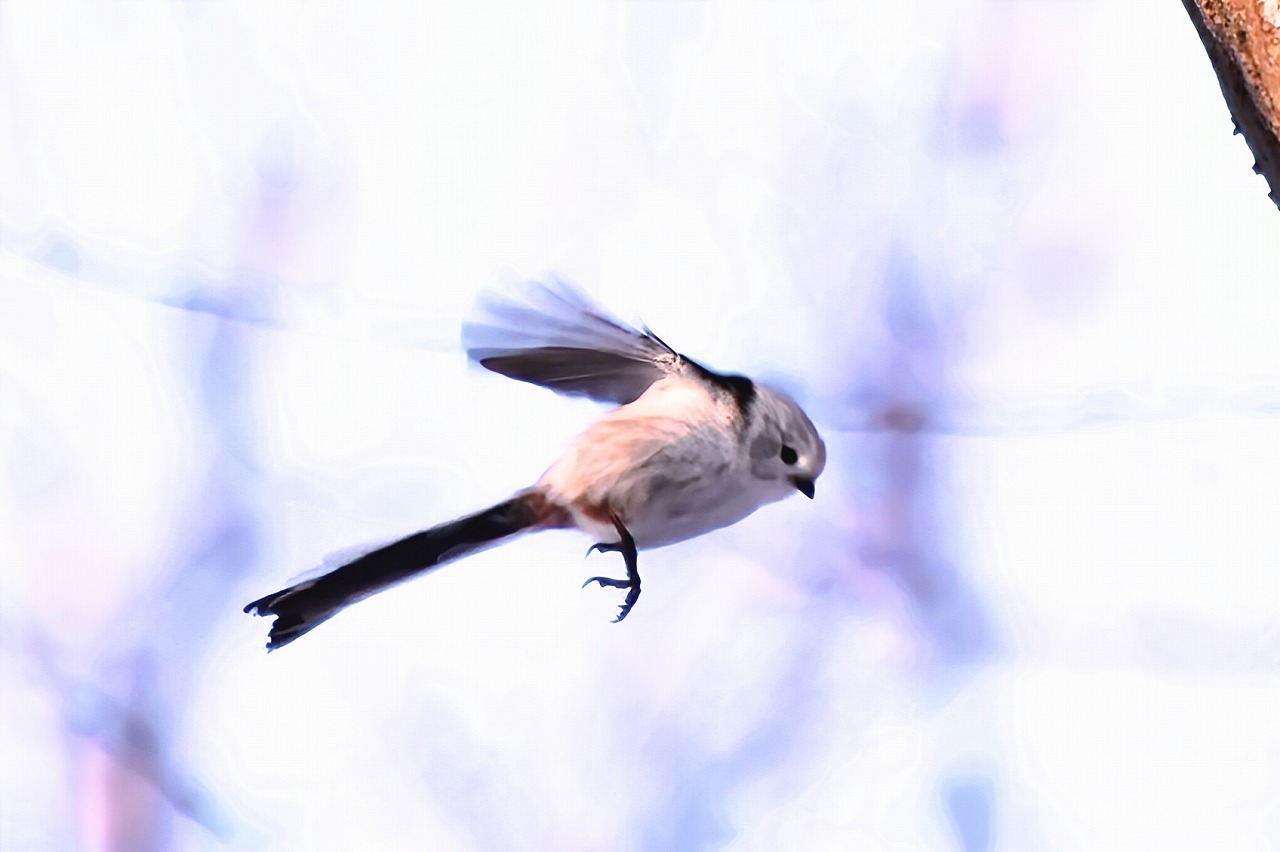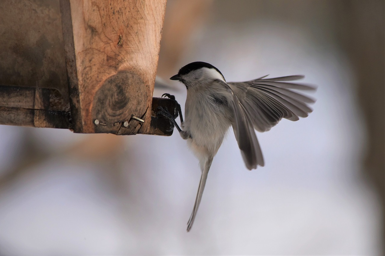 運よくシマエナガがやってきました。スズメ目エナガ科エナガ属の北海道固有の亜種で、本州や九州に生息するエナガとは異なり、頭が純白なのが特徴です。撮影スペースに緊張感と連射のシャッター音が鳴り響きました。