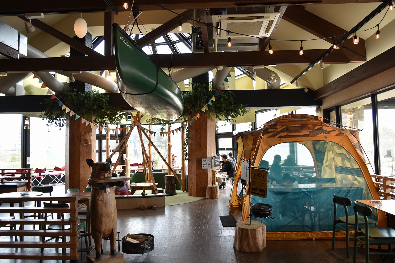 店内はキャンプ場をイメージしており、テントの中やキャンピングチェアに座って食事ができます。天井にはなんとカヌーがぶら下がっていました。