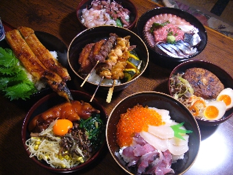 オリジナル丼の「大學丼」は、まず大學堂に行き、200円を渡して丼めしを受け取ります。その後、協賛店のポスターを貼った店をめぐって丼を完成させますが、市場にある120店舗のうち、食材店のほとんどが大學丼の協賛店。関門海峡のタコに、揚げたての天ぷら、福岡名産の明太子もあれば、ヘルシー志向にはアボカドなど、何をトッピングしようか迷うこと必至。丼が出来上がったら、大學堂の店内へ。テーブルやちゃぶ台を置いた座敷など、空いてる席を使って食事をすることができます。ちなみに、野菜のカットなどの簡単な調理は、大學堂のスタッフにお願いしてもOKです。醤油や塩などの調味料、お茶も大學堂で準備しています。