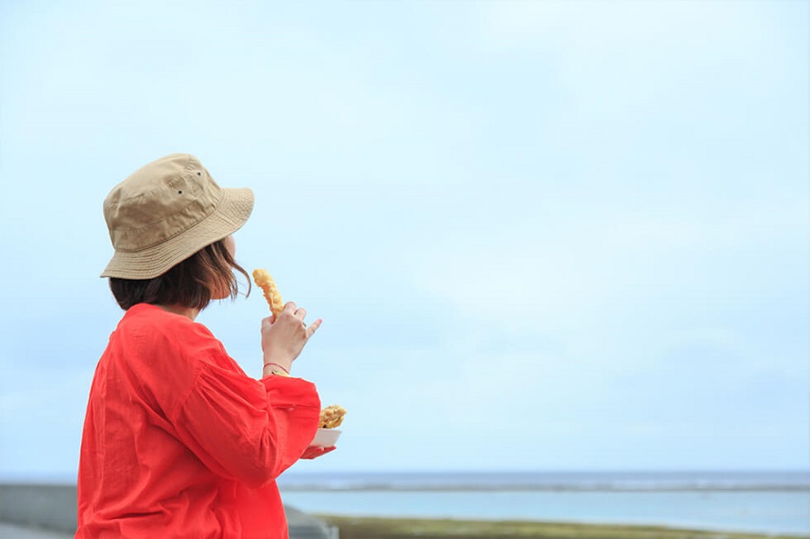 「アーサ」や「もずく」、「さかな」や「いか」をはじめ、季節によっては「島らっきょう」や「ゴーヤー」といった旬の食材を使った天ぷらに出会えることも。紅いも、紅あずま、田いも(ターウム)の3種の芋を練り合わせた「うむにーてんぷら」はここオリジナルです。