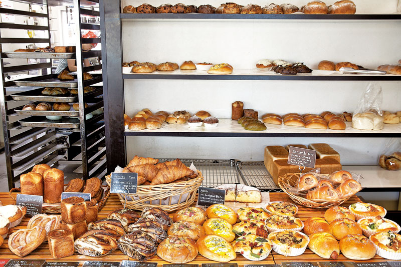 店内はカフェのようにおしゃれで、客がひっきりなしに訪れる地元で評判の店です。その理由のひとつが商品の種類の多さ。陳列台には、色とりどりのパンが並び、デニッシュに調理パン、さらにフランスパンやカンパーニュなどのハード系も品数豊富です。