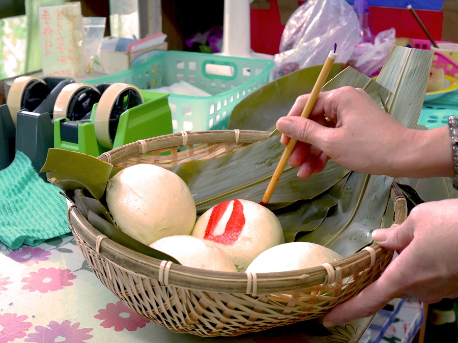 鮮やかな「の」の字は「のし」を表しているとされ祝い事によく出されてきました。首里では今でも、紅白まんじゅうのように卒業式や冠婚葬祭などで供されています。売切れ次第閉店してしまうので、昼前に向かうか、事前に電話予約するのがおすすめですよ。