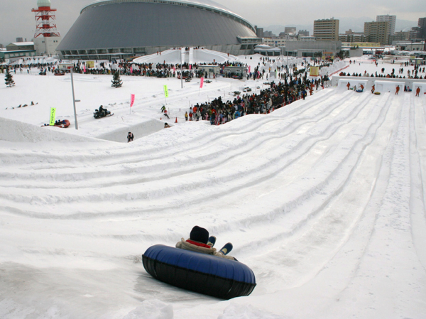 札幌市の東区にあるスポーツ交流施設、通称「つどーむ」を舞台にする、さっぽろ雪まつりの第2会場。雪像鑑賞がメインとなる大通会場とは趣が異なり、体全体を使って楽しめる北海道ならではの“雪”のアトラクションが多数用意されたエリアだ。