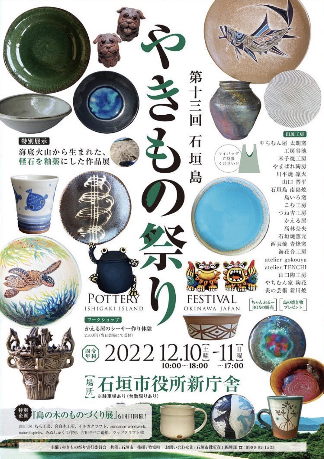 石垣島で行われる人気の陶器市。過去に行われた本イベントでは、石垣島内の窯元にとどまらず、西表島、竹富島、与那国島からの参加もあり、毎回バリエーション豊かなやきものが並んでいます。