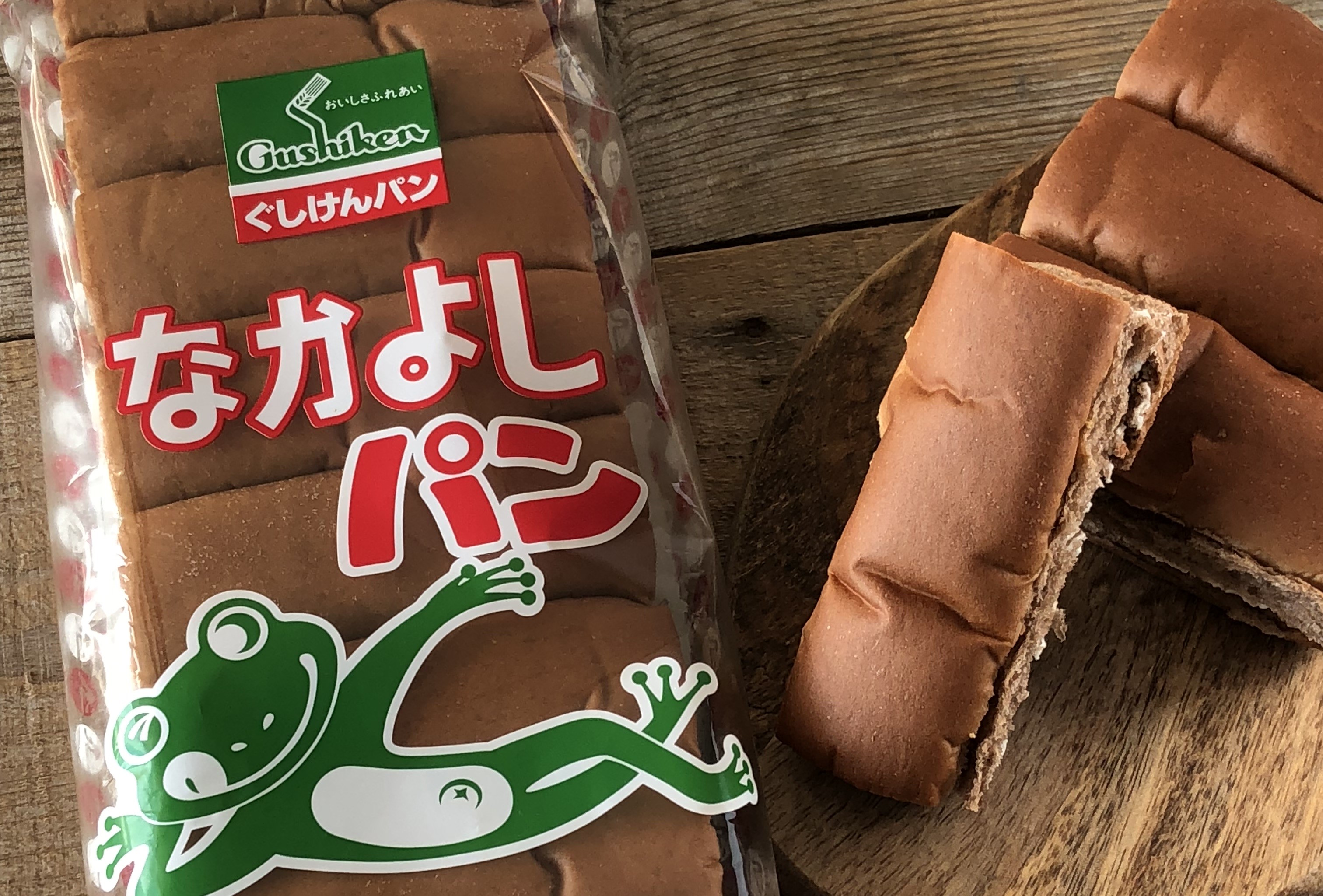 販売元である株式会社ぐしけんは、ニューギニア出征から帰国した具志堅秀一さんが昭和26年(1951)に創業。戦後の栄養価の高い食べ物が少なかった沖縄で、みんなが元気になってほしいという思いから製パン業を始めた。以来、「なかよしパン」は本土復帰前から販売されているロングセラー商品です。また、平成26年(2014)にはピーナツクリームがサンドされた「なかよしピーナツ」という姉妹商品が発売されています。