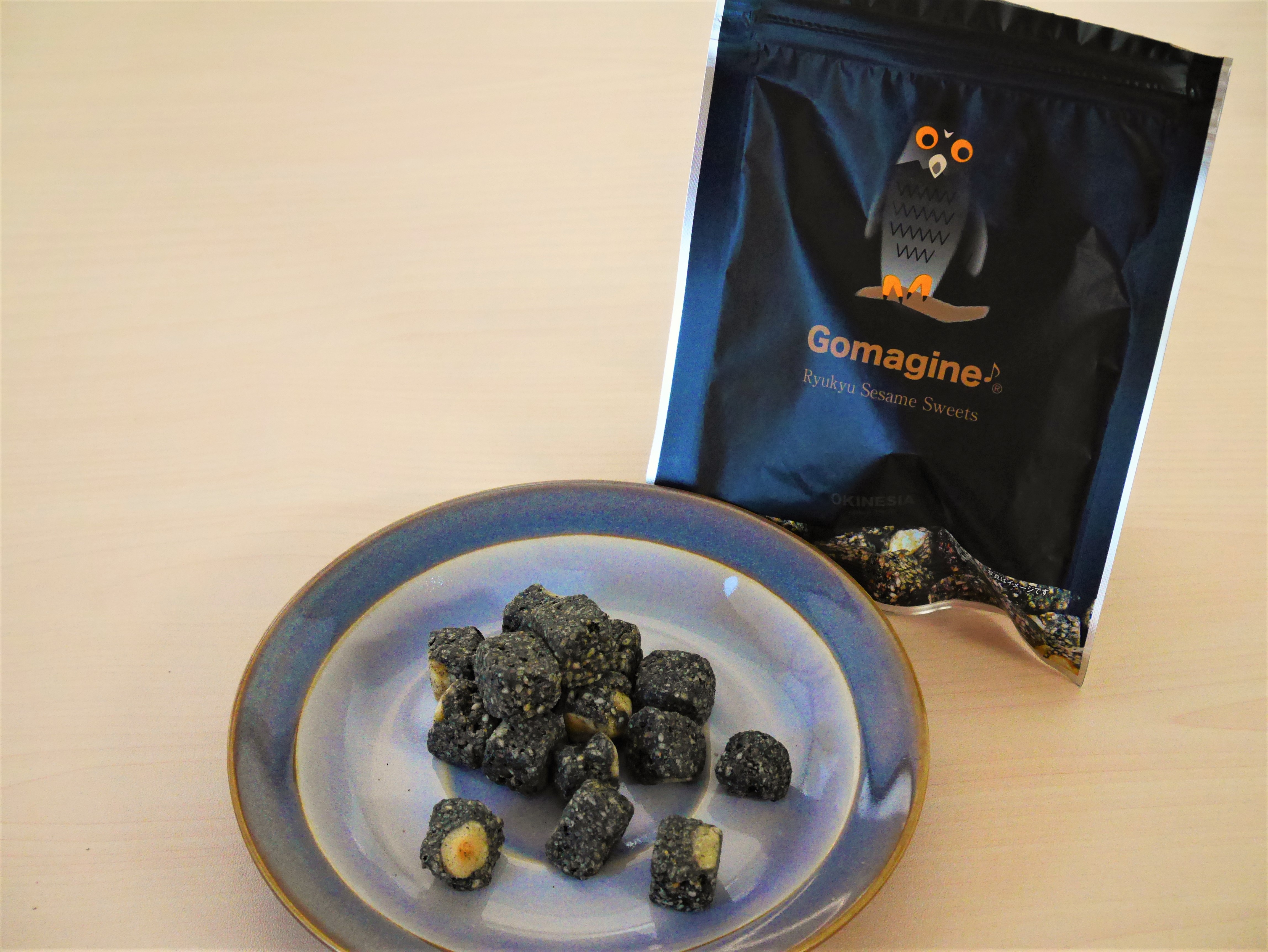2013年12月に株式会社オキネシアが発売した菓子。パッケージには同社の「ごまふくろう」の子ども「ごまじん」がデザインされています。