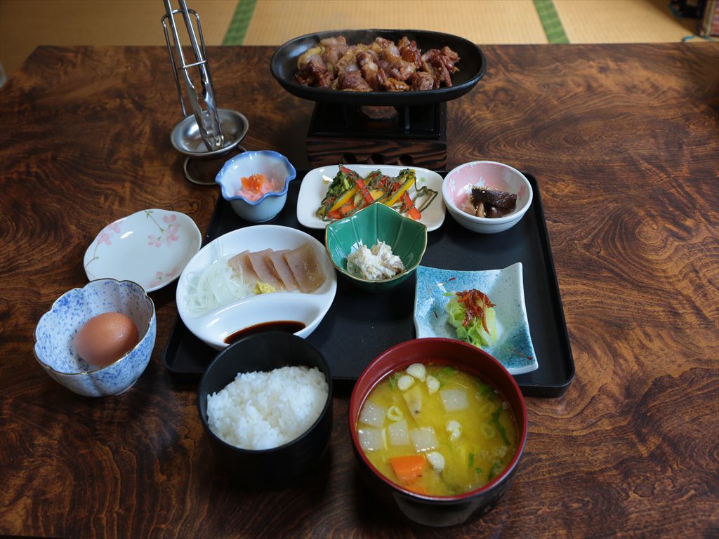 一番人気の「地鶏定食」は炭火で表面を炙った後、たれをつけ鉄板に載せて提供される地鶏に採れたての卵、熊本名物の「だご汁」、さらに山菜や地元で栽培された野菜、こんにゃくなどのおかずがつきます。
