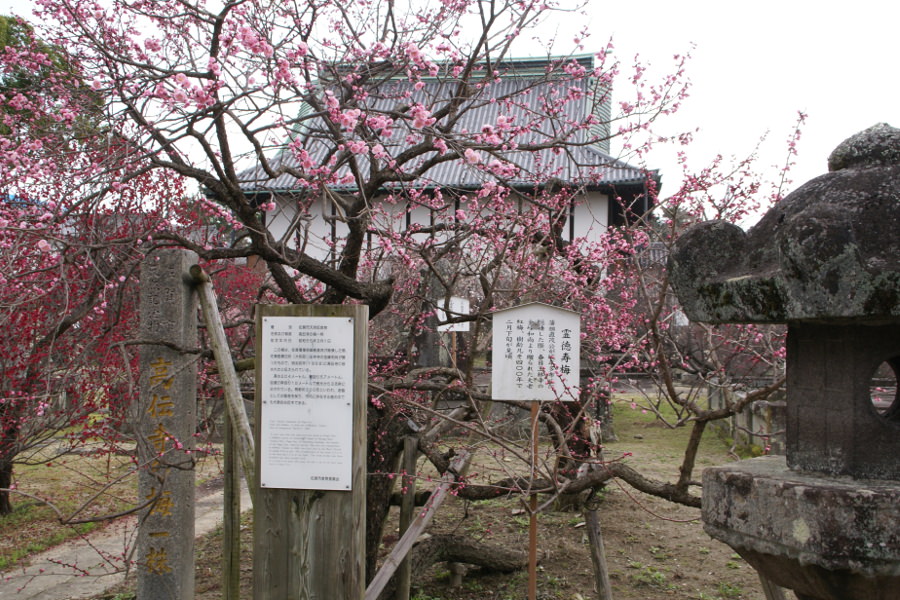 旧佐賀藩主鍋島家の菩提寺である「恵日山 高傳寺(こうでんじ)」は、佐賀市の中心部から西南へ約3キロのところにあり、竹林の一角に囲まれた古刹。約700本の梅の木が開花シーズンを迎えると、多くの参詣者でにぎわう梅見スポットです。