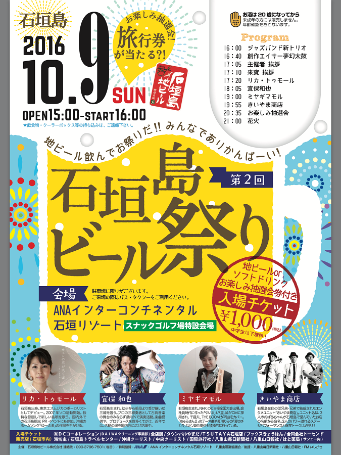 日本最南端のビール工場で誕生した「石垣島地ビール」を味わいながら、きいやま商店やリカ・トゥモール、宜保 和也、ミヤギマモルが出演する音楽ライブや、創作エイサー演舞、豪華商品が当たる抽選会などが楽しめるイベント。