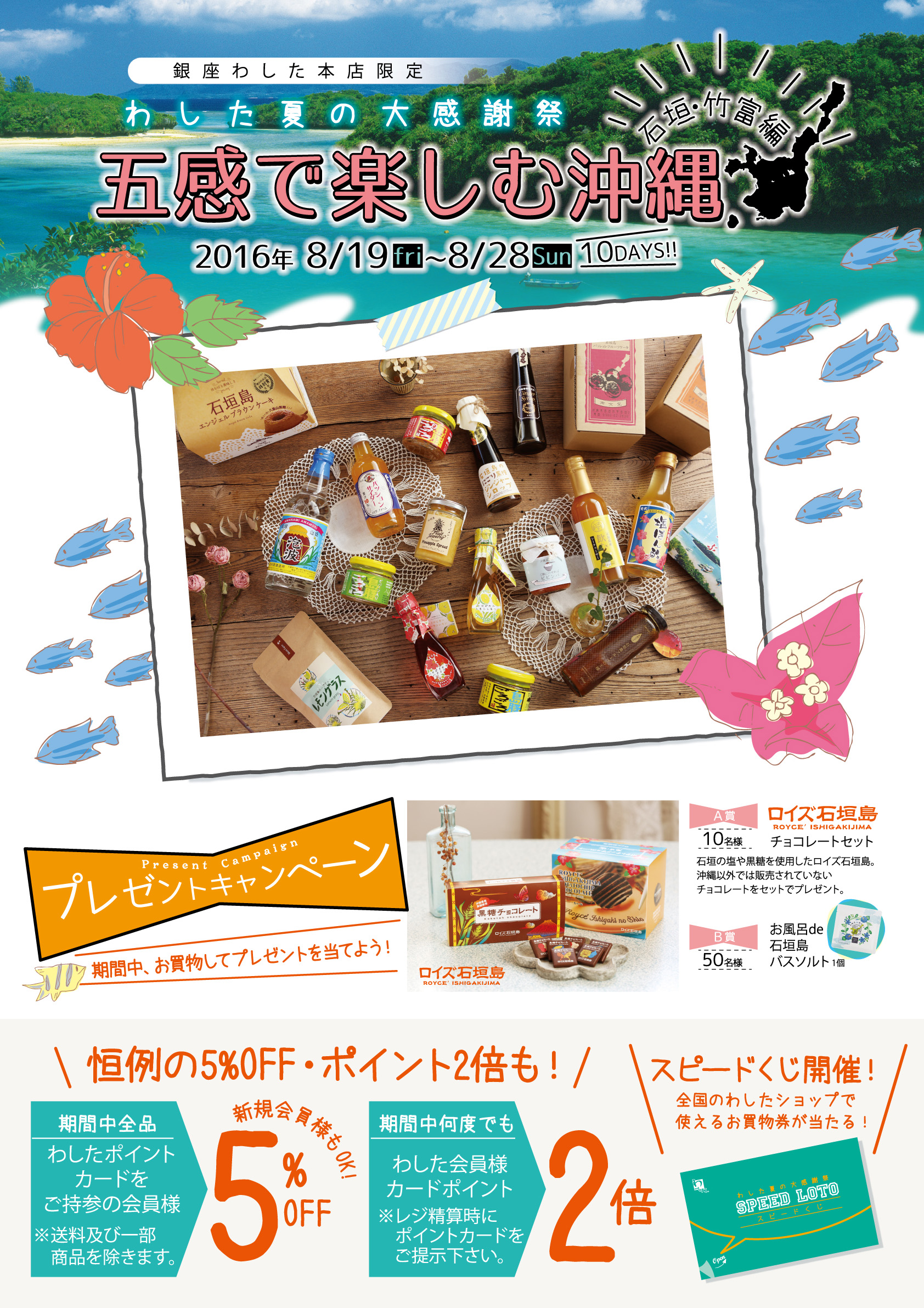 2016年8月19日(金)~28日(日)の期間中、東京・銀座にある「銀座わしたショップ本店」で「五感で楽しむ沖縄~石垣・竹富編~」が開催されている。