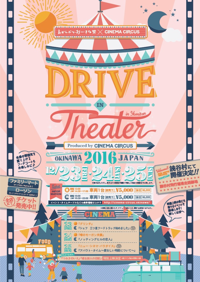 2016年12月23日(金)~25日(日)の3日間、沖縄県読谷村(よみたんそん)飛行場滑走路跡地で「ドライブインシアター」が開催される。