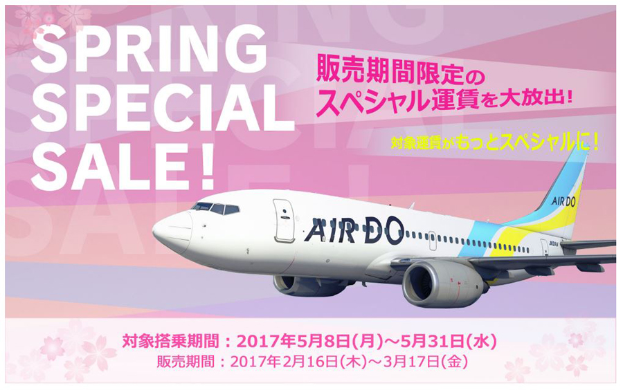 平成29年(2017)2月16日(木)~3月17日(金)まで、AIRDO(エア・ドゥ)が、割引運賃「AIRDOスペシャル75」のスペシャル運賃を販売中。