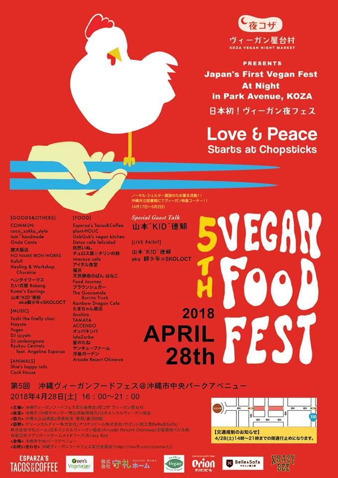 平成30年(2018)4月28日(土)、沖縄県沖縄市・中央パークアベニュー商店街で「第5回 沖縄ヴィーガンフードフェス2018」が開催されます。