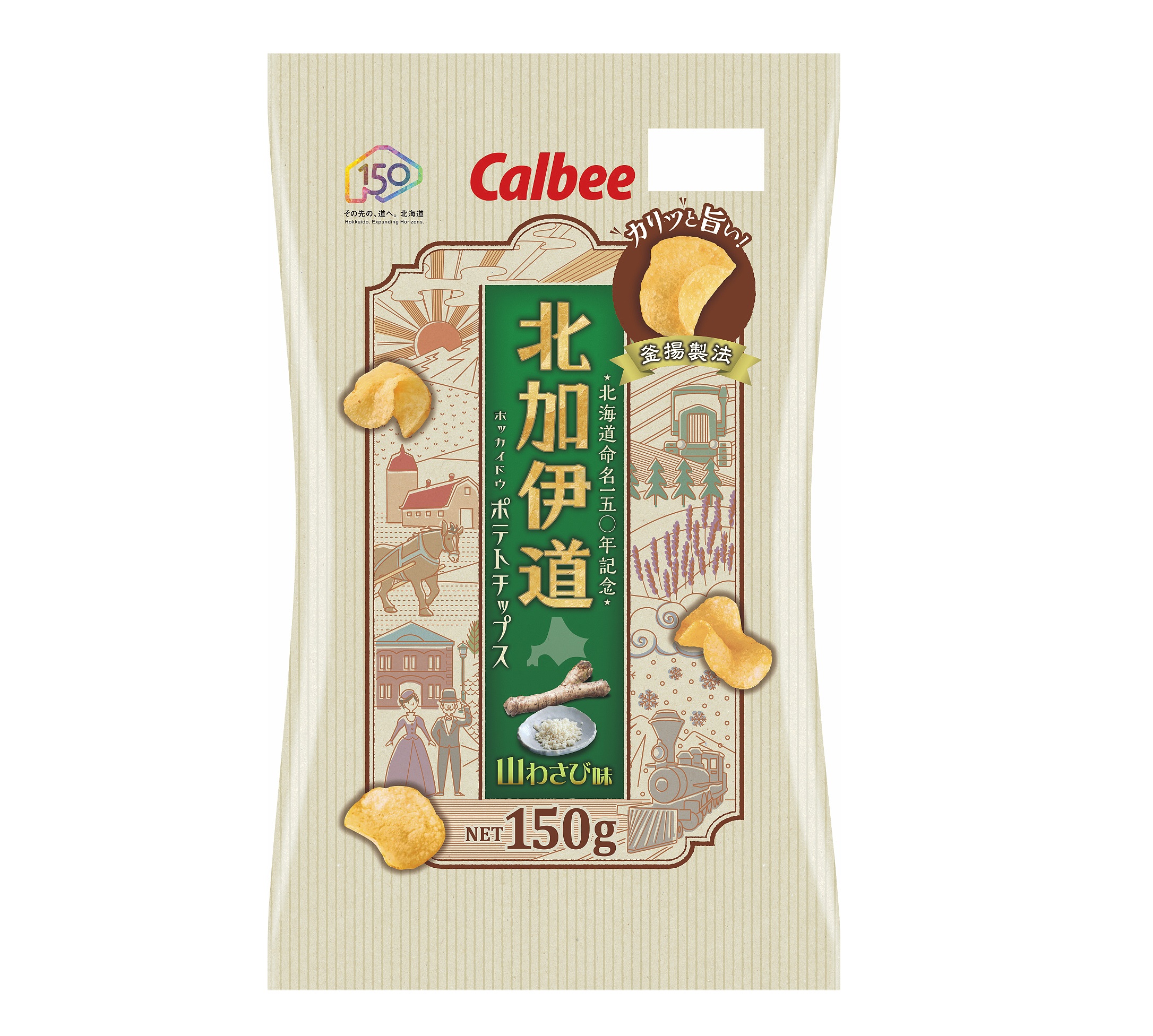 「かっぱえびせん」、「ポテトチップス」などのヒット商品で知られるスナックメーカー「カルビー株式会社」は、北海道命名150年を記念した商品として、北海道ならではの山わさび味を楽しめる「北加伊道(ほっかいどう)ポテトチップス山わさび味」を北海道限定で2018年8月6日(月)に発売します。