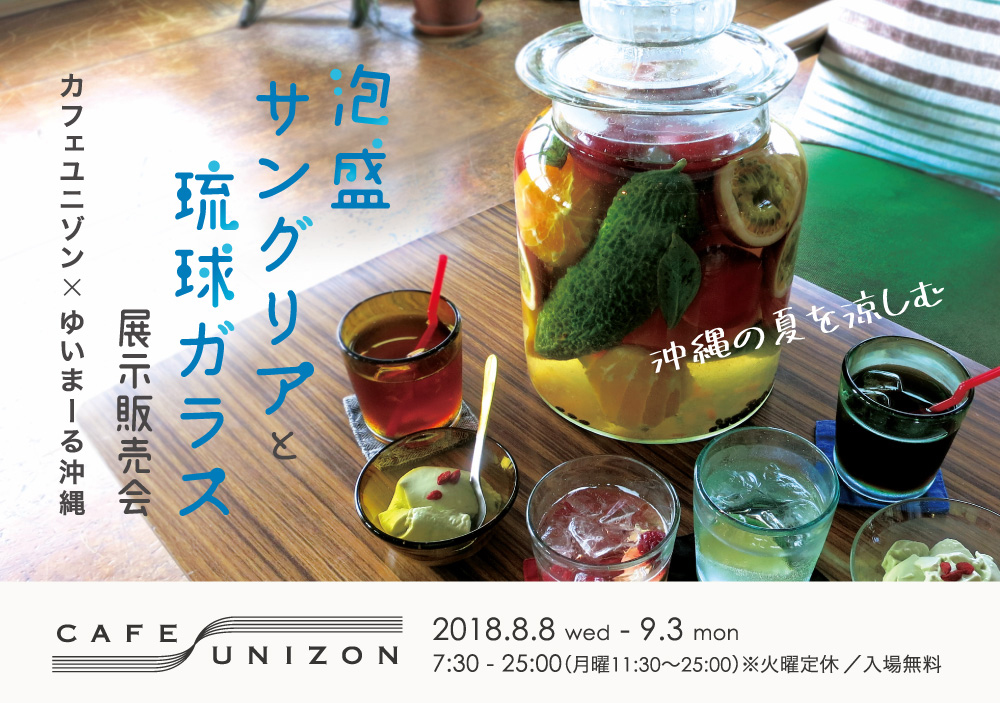 2018年8月8日(水)から、「沖縄の夏を涼しむ」をテーマにゆいまーる沖縄と宜野湾市にあるカフェユニゾンがセレクトした、泡盛サングリアと琉球ガラスの展示即売会が開催中です。
