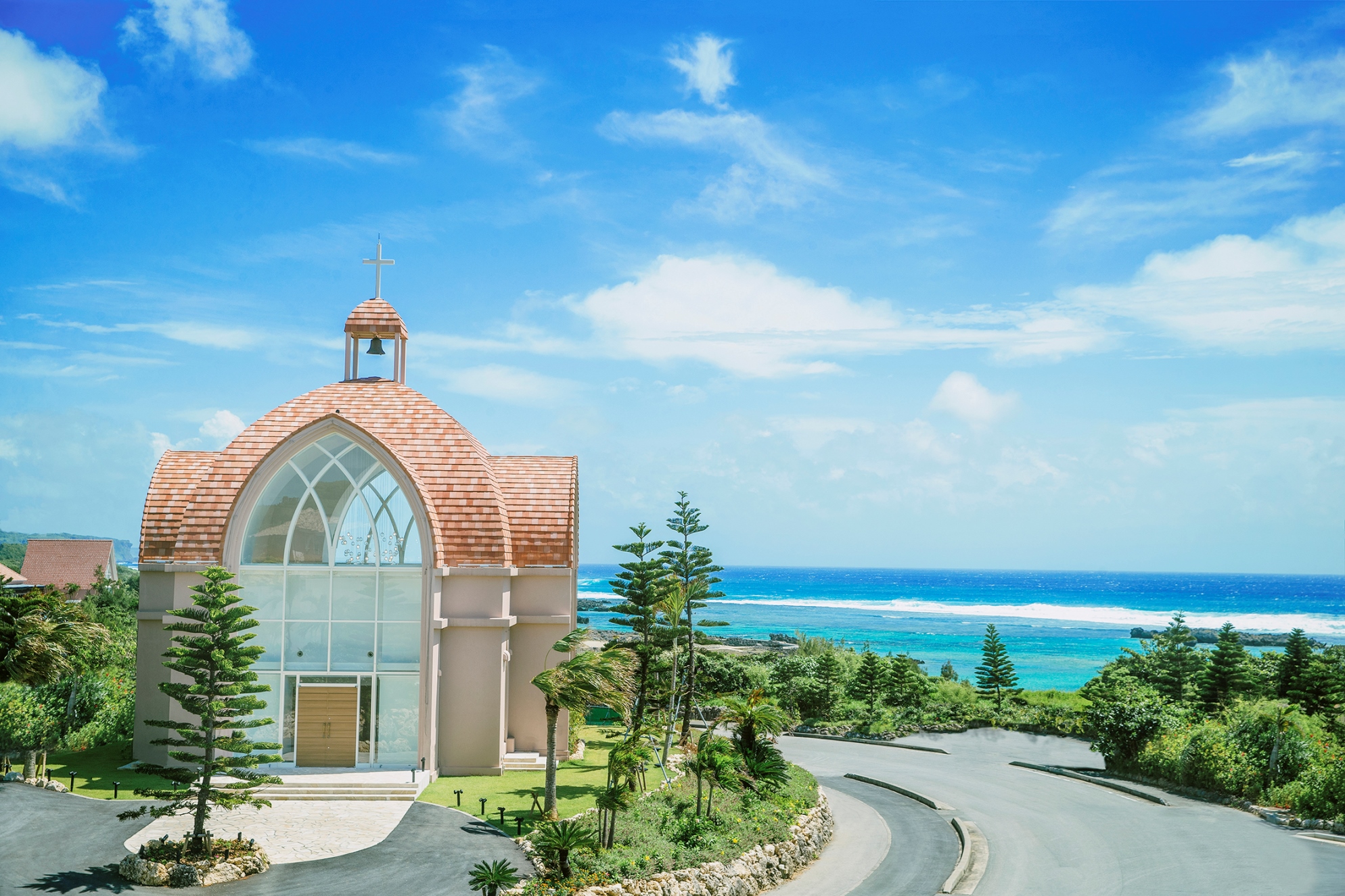 その宮古島の爽やかな風や香りを存分に味わえるように、プライベート感溢れるエントランス付きの独立型チャペルへはオープンカーで向かう演出も。チャペル内は3方に大きな窓があり、その向こうにはシギラリゾートの素晴らしい自然が広がります。また11メートルもの高い天井から降り注ぐ光が、2人をより輝かせてくれますよ。
