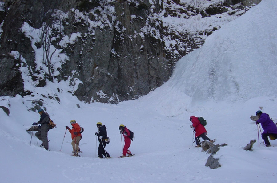 これは、銀河ノ滝直下までスノーシューで散策し、天然氷瀑に直接触れたり、フロストフラワー(冬の華)を見るというもの。厳冬期に期間限定で実施されるこのプログラムは、森林管理署に特別の入林許可を申請し、安全確保のためにガイドが同行したうえで特別に催行される。防寒ウェア、帽子、手袋など温かい手袋を持参しよう。
