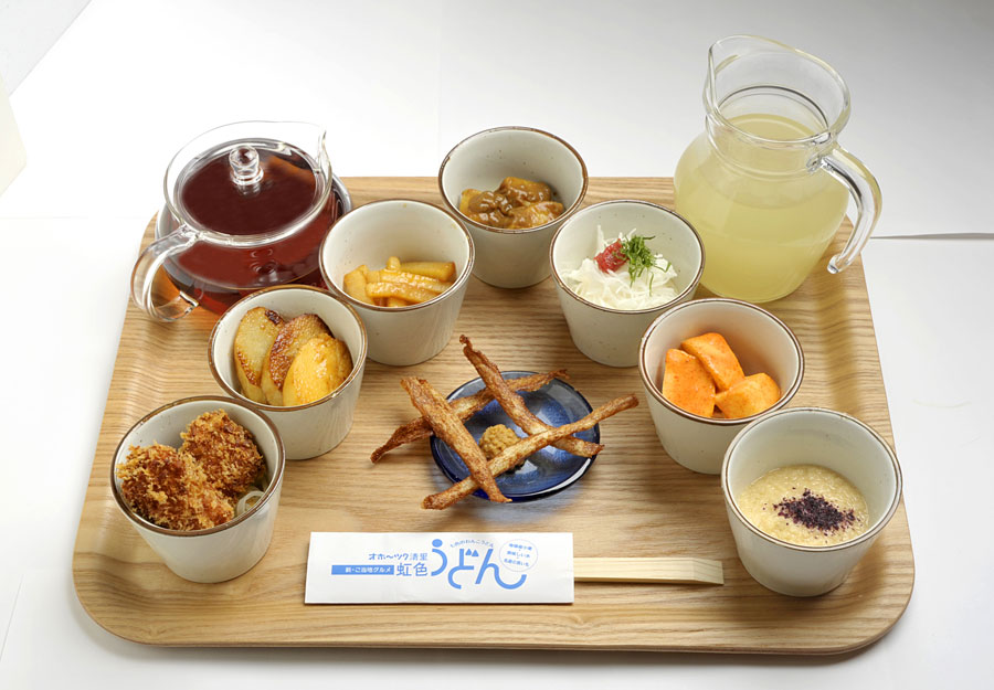 地元産の小麦「きたほなみ」と、斜里岳を水源とする美味しい水を使った細麺のうどんに、さまざまな調理法で作られた、7種類のわんこうどん。斜里岳をイメージして山型に配置された7つのお椀は左下から和風だしの温つゆで食べる長いものカツ(竜田風)、ステーキ(ダシ醤油味)、きんぴら(和風味)、一番上にあるのは、つゆを使わないカレー、続いてコンソメ塩味の冷つゆで食べる長いもソーメン(梅味)、キムチ、とろろ(ごま油味)になっている。神の子池に見立てた青い皿のデザートは、名産の長いもチップス(山わさび付)。