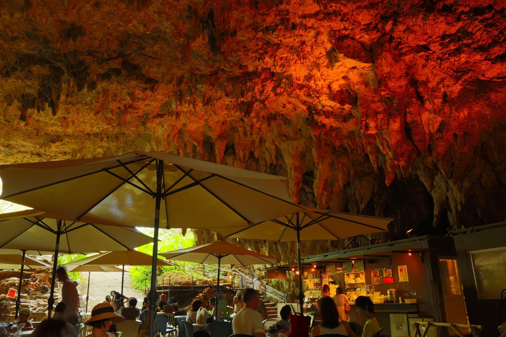 太古の洞窟を探検できるテーマパーク「ガンガラーの谷」にある洞窟カフェ。天然の鍾乳洞をそのまま利用し、壁も全て自然の形のままになっています。洞窟の中は夏場でもひんやりと涼しく、神秘的な雰囲気を味わいながら休憩することができます。この独特な空間を生かした写真展や結婚式、ライブなども開催されています。