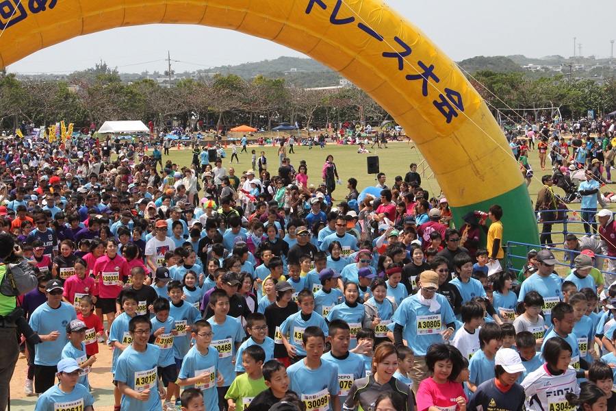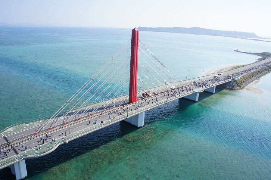「あやはし海中ロードレース大会」は、沖縄本島中部のうるま市与那城(よなしろ)で開催されるハーフマラソン大会。コースは、人気のドライブスポットである全長4.7キロの「海中道路」をメインに、平安座島(へんざじま)、浜比嘉島を駆け巡ります。