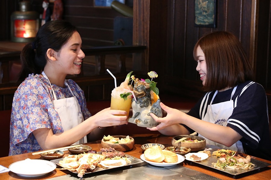 シーサー&トロピカルドリンクで南国気分を満喫。