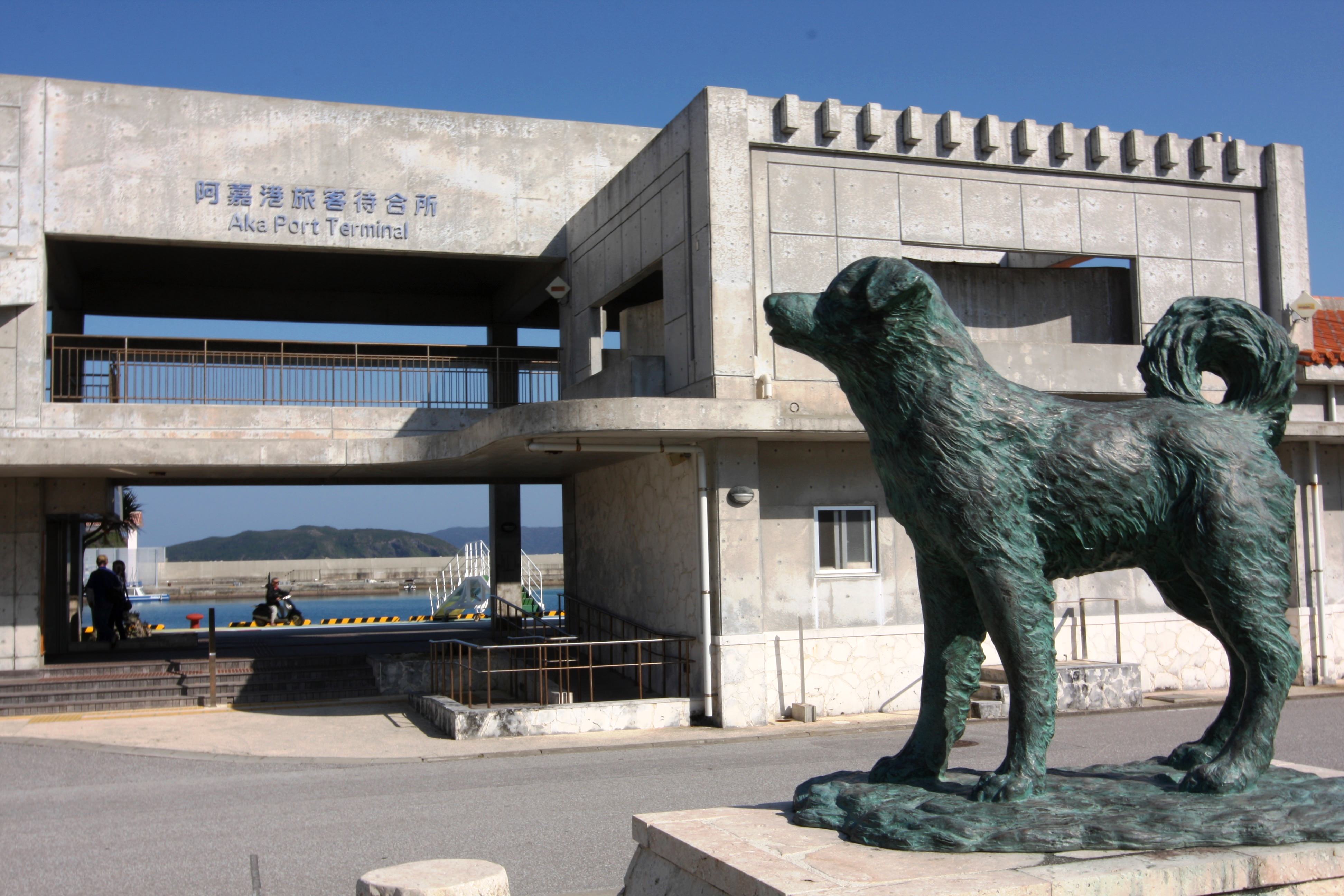 昭和63年(1988)に大ヒットした映画「マリリンに逢いたい」。慶良間諸島の海と自然を舞台に制作された。その主人公となった雄犬シロの銅像が、阿嘉島の港、フェリー乗り場前の公園に設置されている。この映画は、座間味島に住んでいる雌犬マリリンと阿嘉島に住んでいるシロが恋をして、約3キロもある二島の間の海を泳いで会いに行くという感動のラブストーリー。もちろん実話だ。この話を風化させないようにと島の有志が中心になって資金を集め、シロの銅像を作った。一方のマリリンの像は座間味島にあり、互いに向き合うように置かれている。