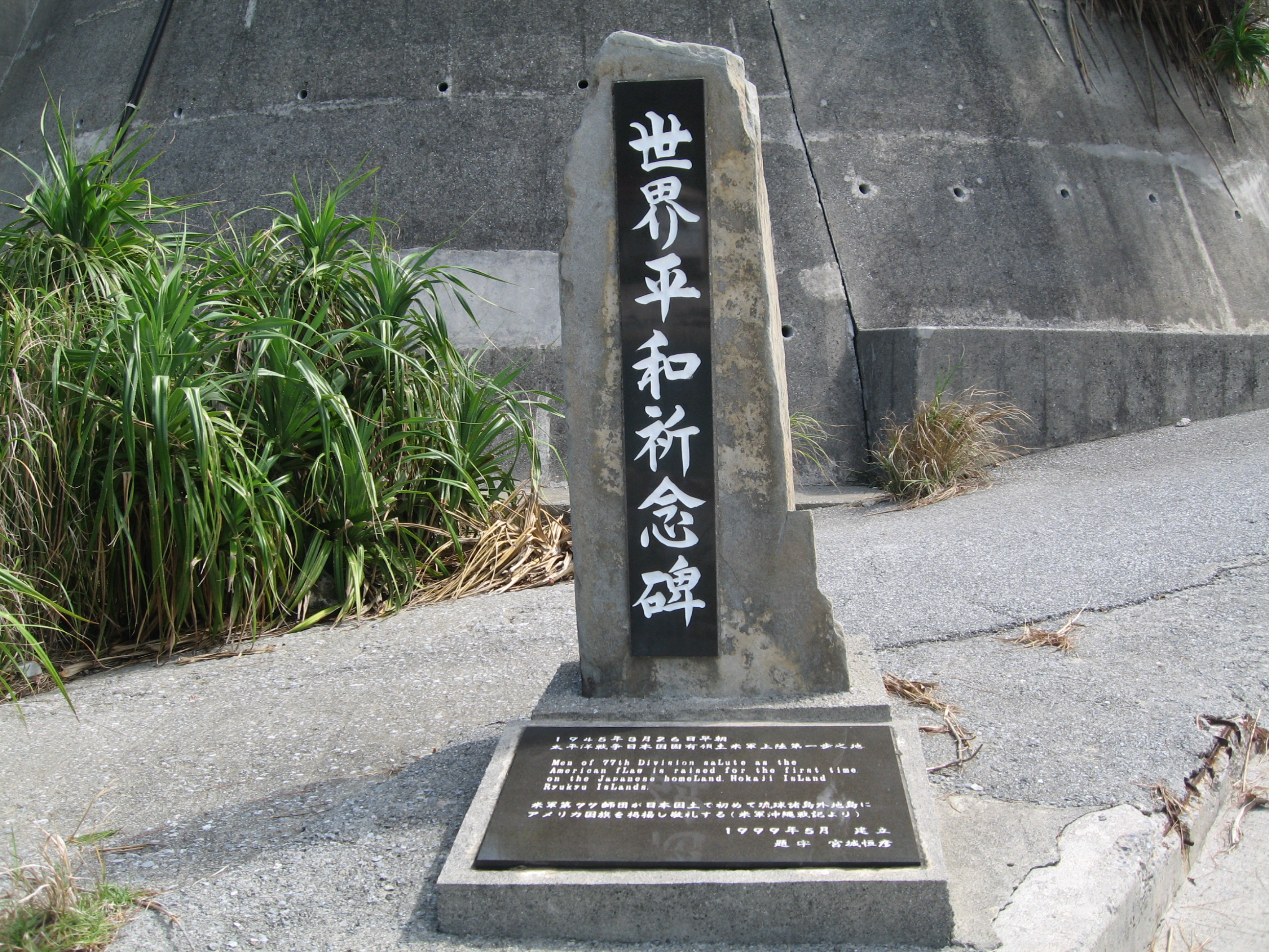 慶良間諸島、阿嘉島から慶留間島に渡り、慶留間島さらに橋を渡った先にあるのが外地(ふかじ)島。慶良間諸島を一望できる展望台があり、手つかずの風光明媚な島として知られるが、実は、太平洋戦争で米軍が日本に初めて上陸したのが、この島。昭和20年(1945)3月26日の早朝、この島に上陸したのを足掛かりに米軍は沖縄本島へと向かった。平成11年(1999)に世界平和を祈念して碑が建立された。慶留間島、外地島には、このほかに戦争の傷跡が多く残されている。