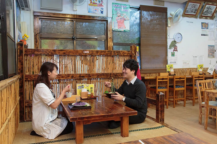 もともとはクリーニング店を営んでいた両親が沖縄そばの店にリノベーションした店内。何十年も前からそば屋さんだったかのようなほっこりした時間が流れています。