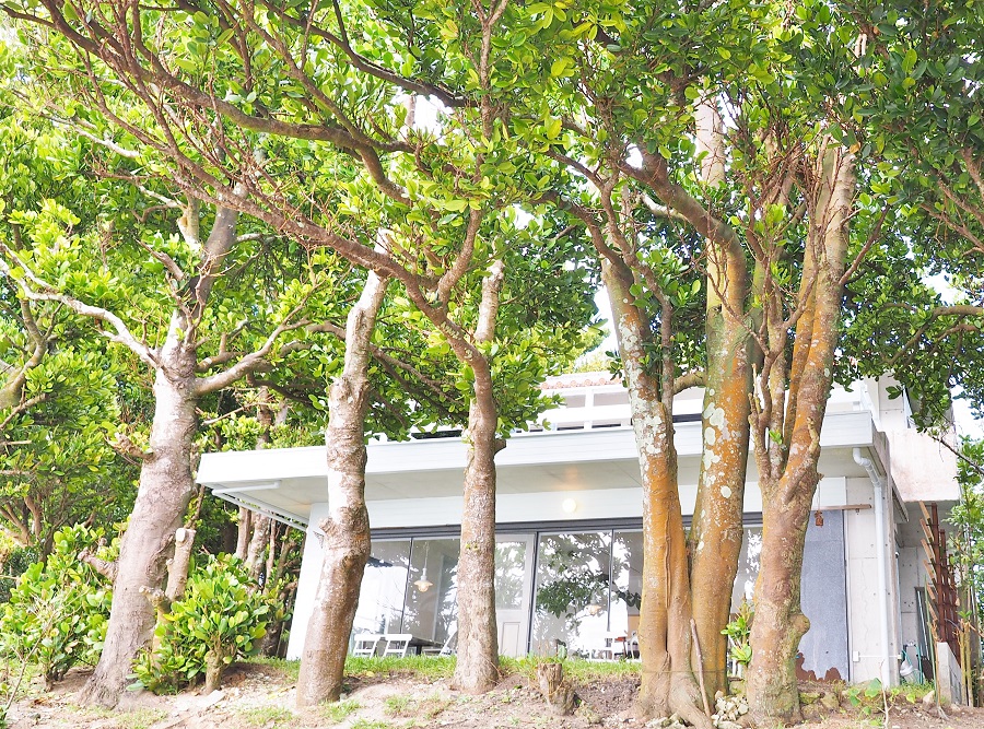 沖縄県北部の本部町にある人気スポット「備瀬のフクギ並木」近くにある「ULTRA BLUE 海辺のレストラン」。真っ白でスタイリッシュな外観がフクギ並木と見事にマッチするおしゃれなカフェです。
