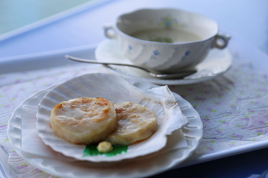 オホーツクタワーで味わえるのが地元産の貝柱をぜいたくに使ったホタテのステーキ。いくつもの貝柱を寄せ集めて一つにした肉厚でジューシーなステーキが2枚にジャガバタースープがついた「ガリンコステーキセット」がなんとワンコインの500円で堪能できるのだ。ちょうどよい塩味で、お好みで皿に添えられたバターを少しずつ溶かしながらかじりつけば幸福感に浸れるはず。海外からの観光客にも人気だという。窓の外は一面の海。食後はガリンコ号が湾に出入りする姿を眺めながら、温かいコーヒーやココアで一息。